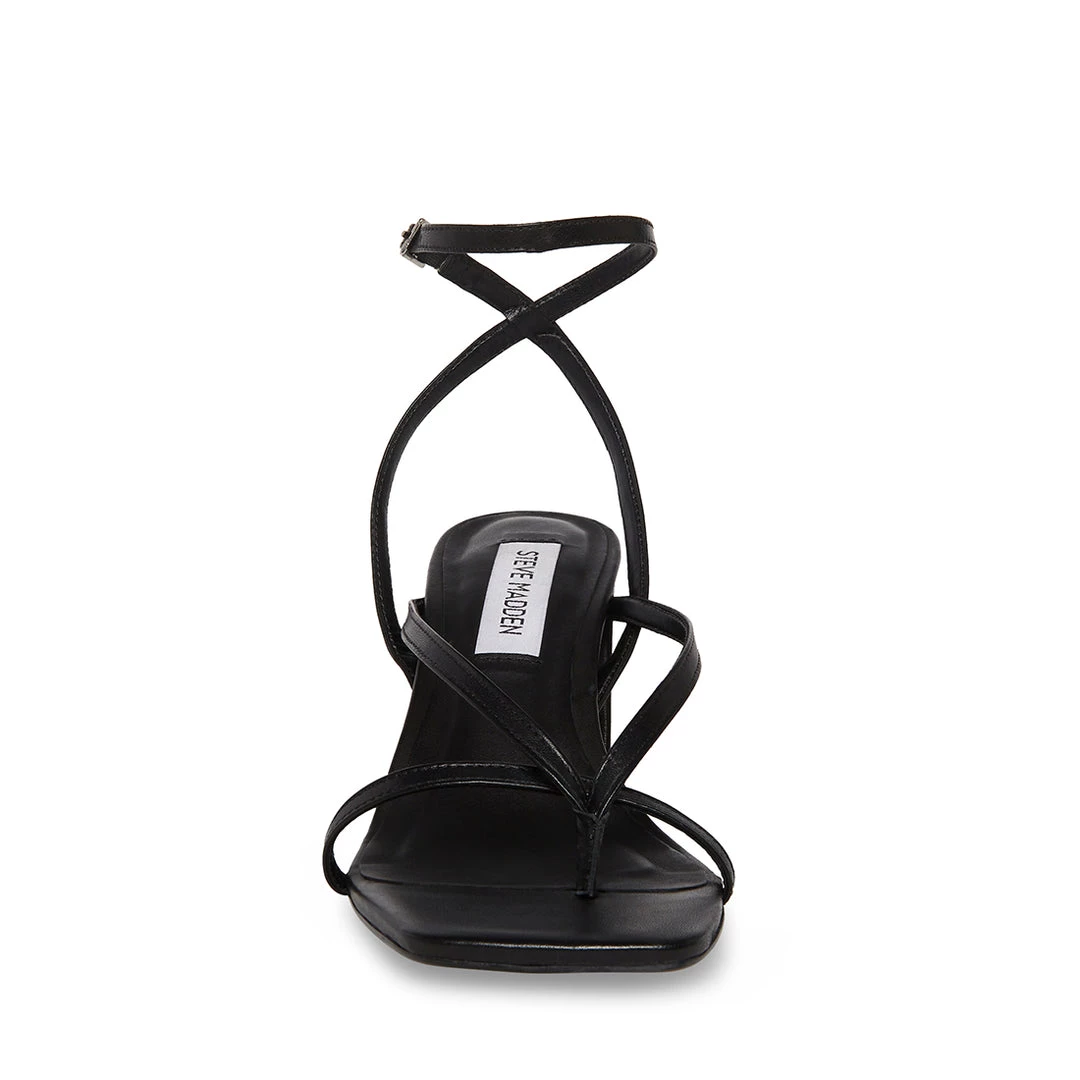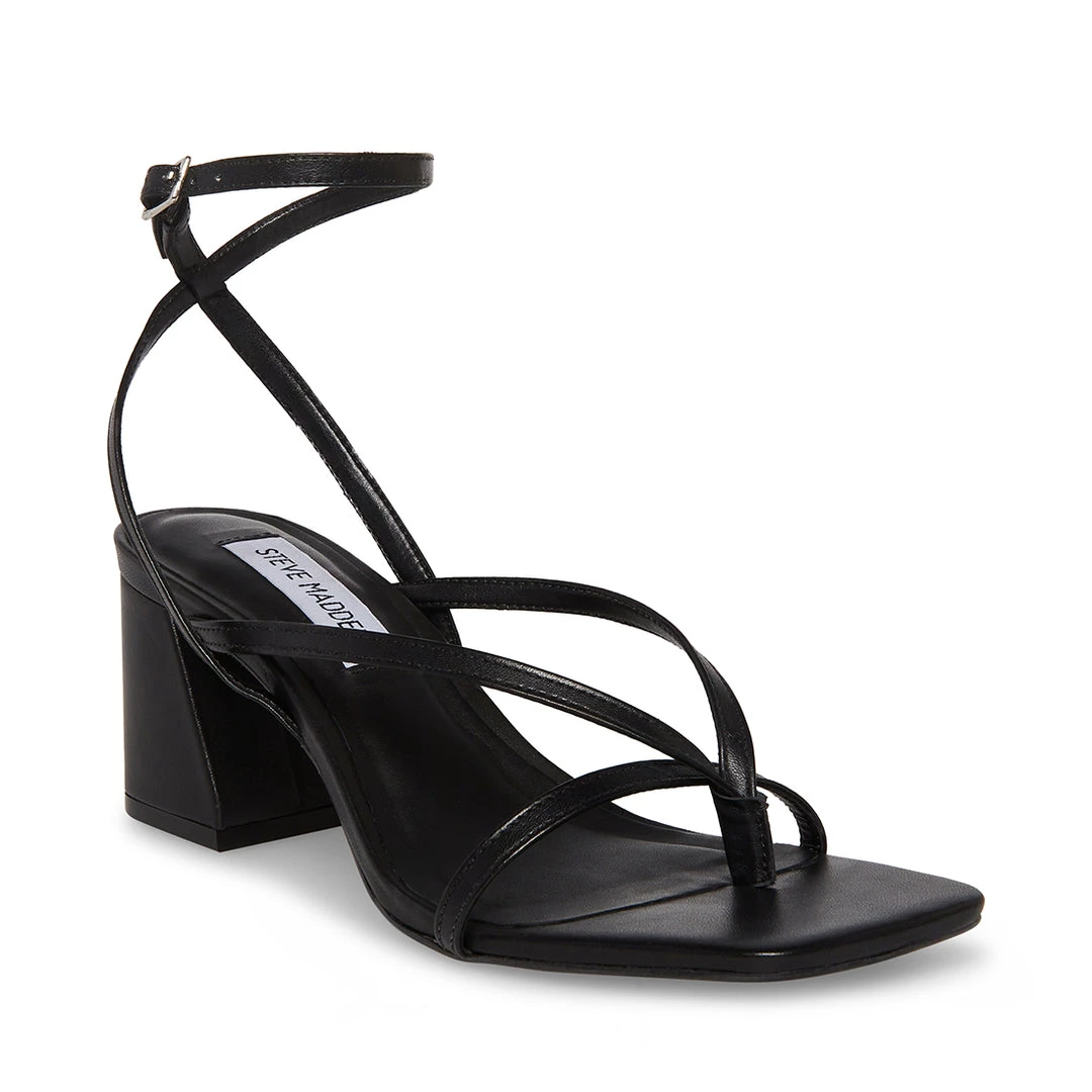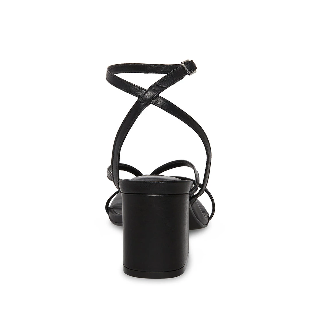 An angled block heel adds just-right height to an effortless minimalist sandal featuring slim leather straps and a square toe.