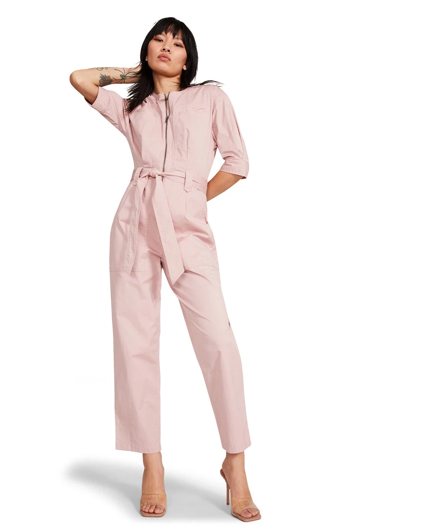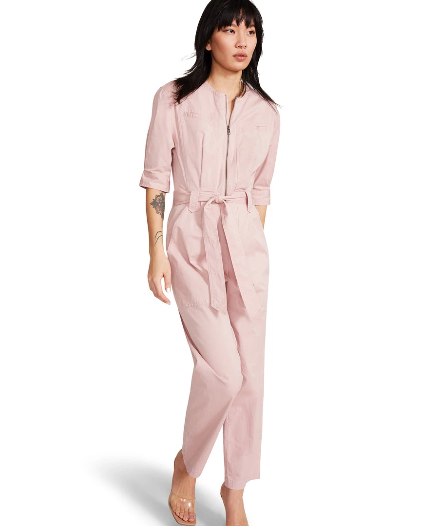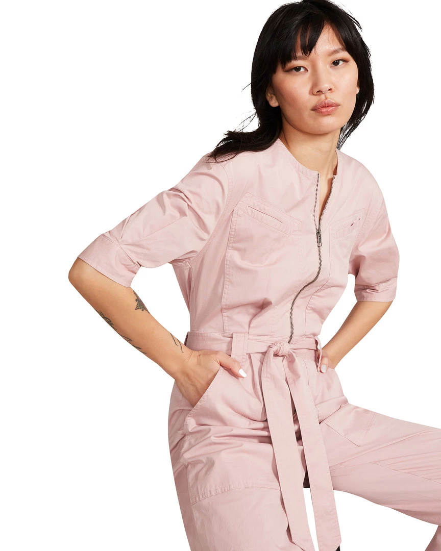- Belted 3/4 sleeve jumpsuit with quarter zip and pockets.