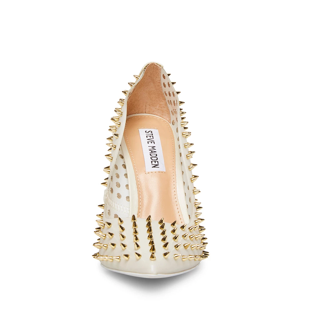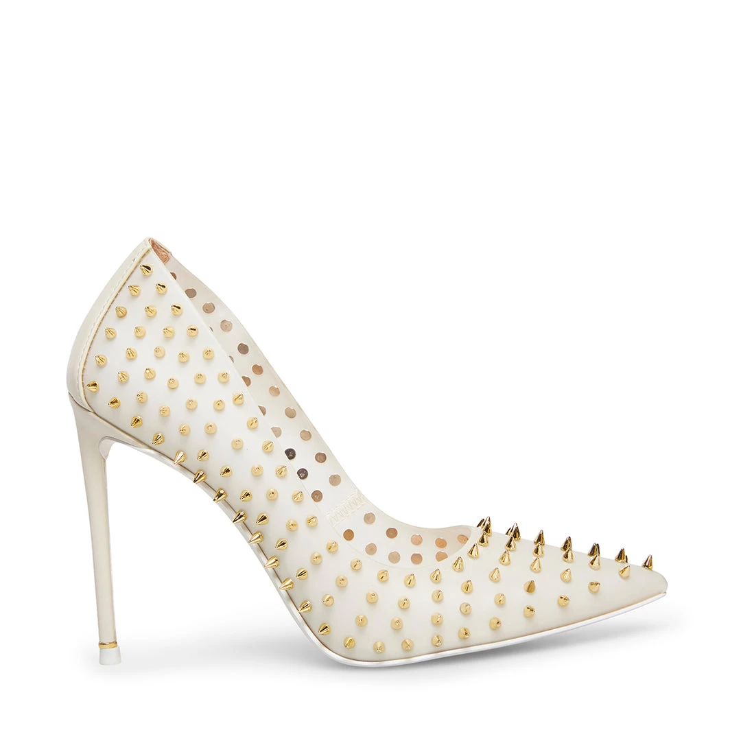 Make a fierce statement day or night donning VALA-S! This sharp pump is covered in metal spikes that accentuate its pointy toe and stiletto heel.