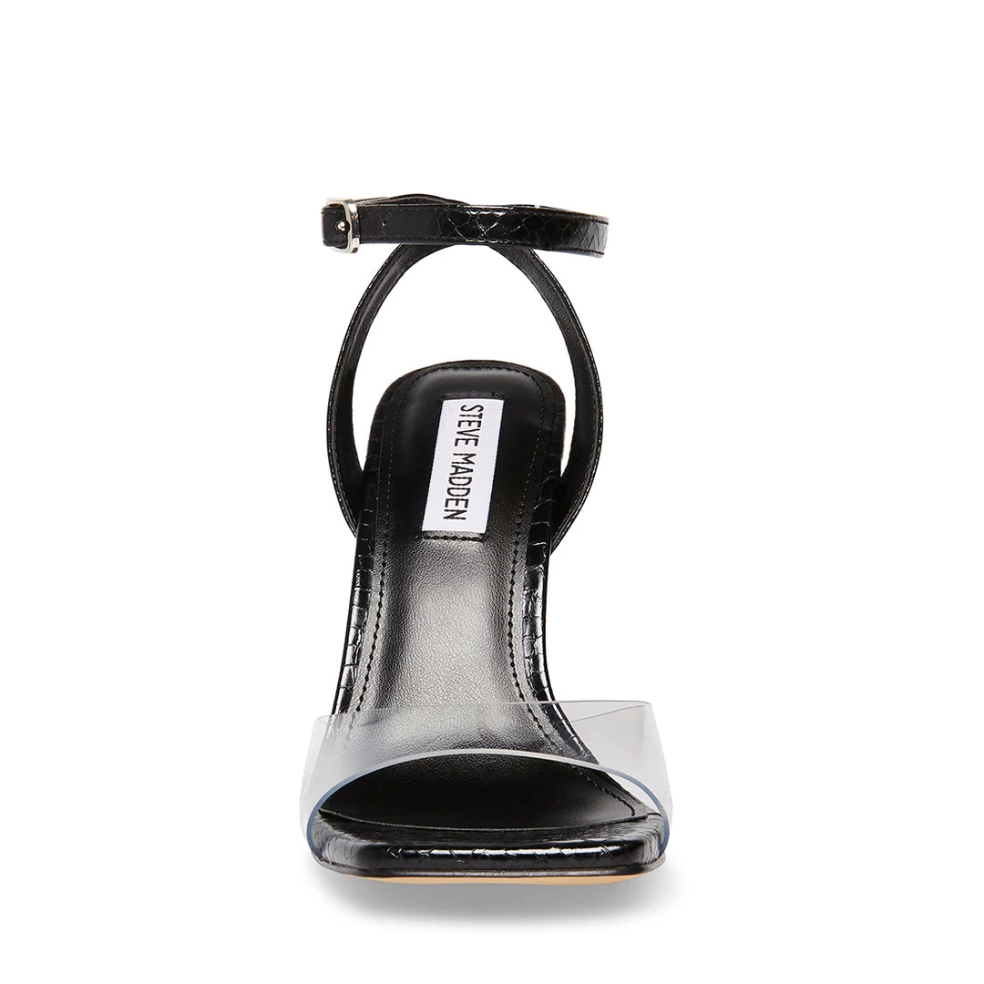 A see-through strap and square toe complement this stiletto’s faux snakeskin surfaces for a super-sexy barely-there look.