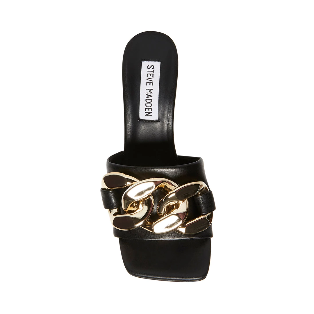 Trim your toes in statement chain! Oversized metal links dress up this sexy slide, while a just-high-enough heel lifts and flatters.?ÿ