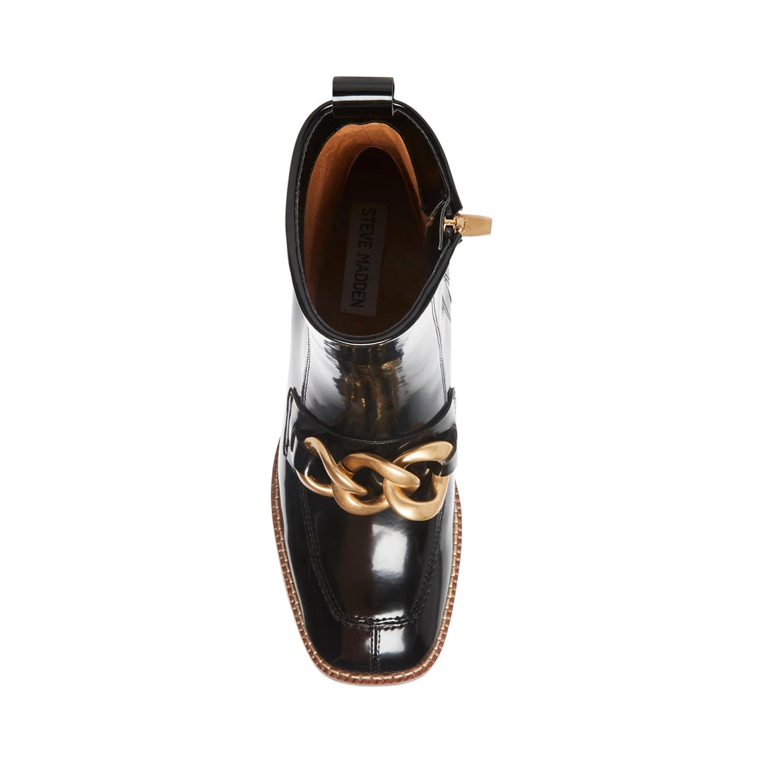 Give basic ankle boots a break with LOREEN. This patent pair features a mod block heel and bold chain hardware. Wear them with an all-black outfit for a bit of drama.