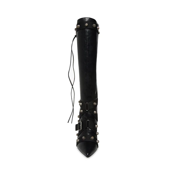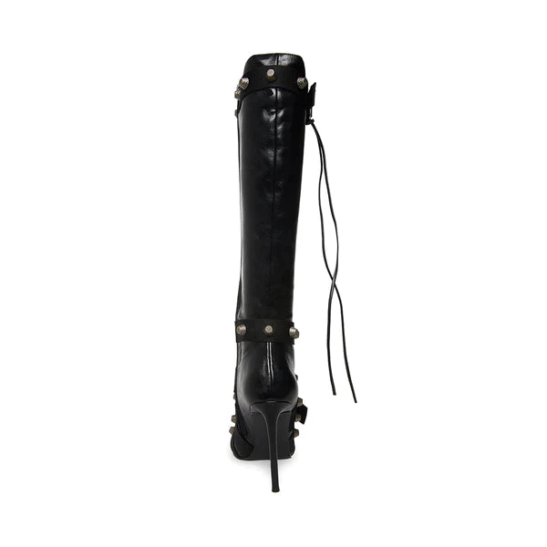 With FINK, you will be the center of attention. These stiletto boots have a vegan leather construction with crisscross buckle straps around the ankle, and hardware embellishments.
