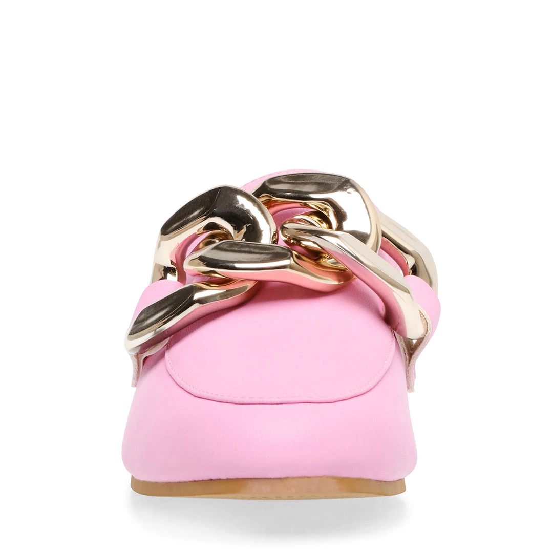 A gigantic chain link strap lends lighthearted luxury to this classic mule — a choice silhouette of the season and favorite of cool girls everywhere.